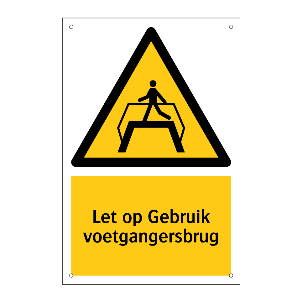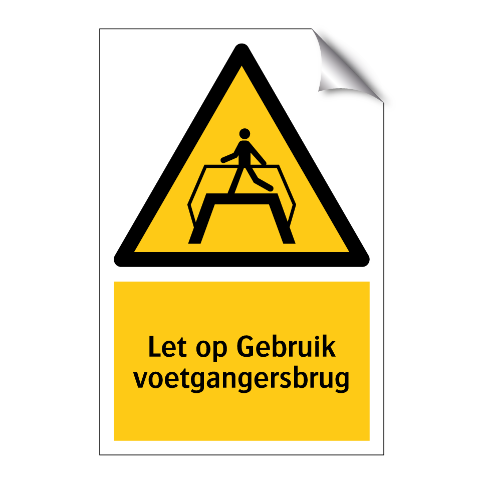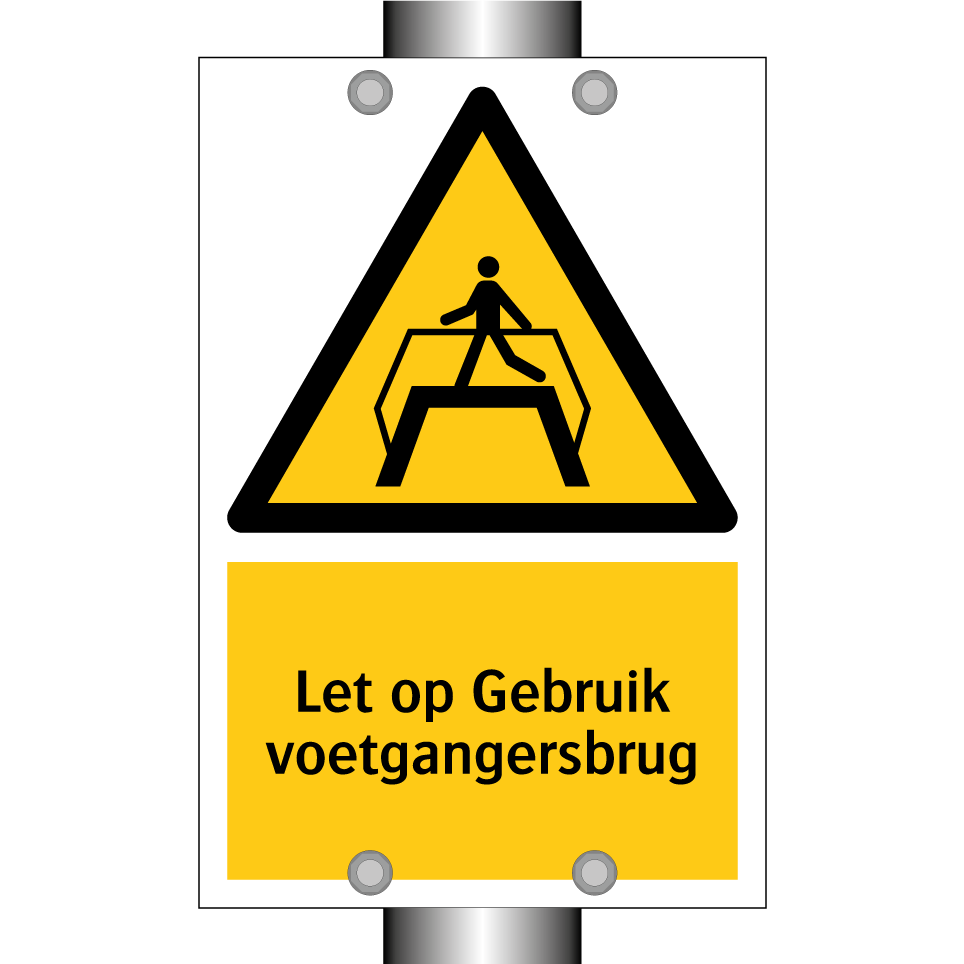 Waarschuwingsbord met de tekst Let op Gebruik voetgangersbrug