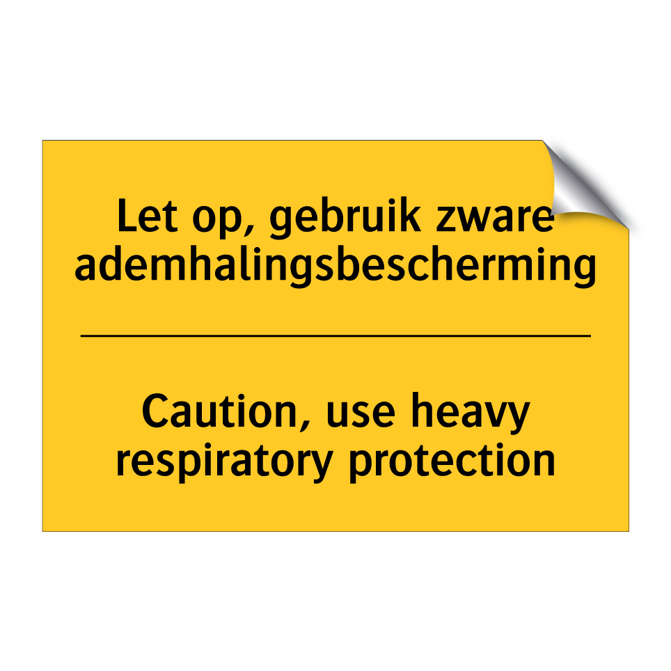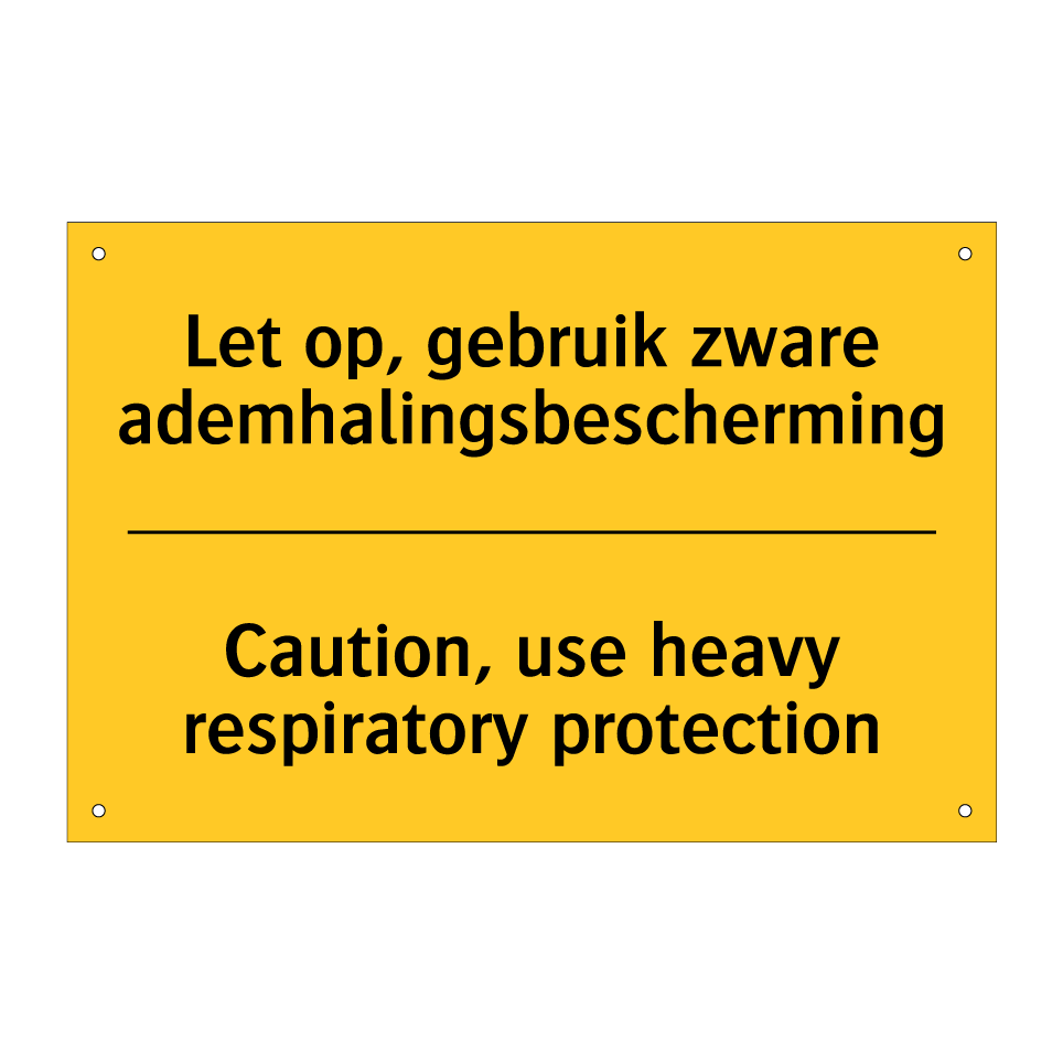 Waarschuwingsbord met de tekst Let op, gebruik zware ademhalingsbescherming / Caution, use heavy respiratory protection