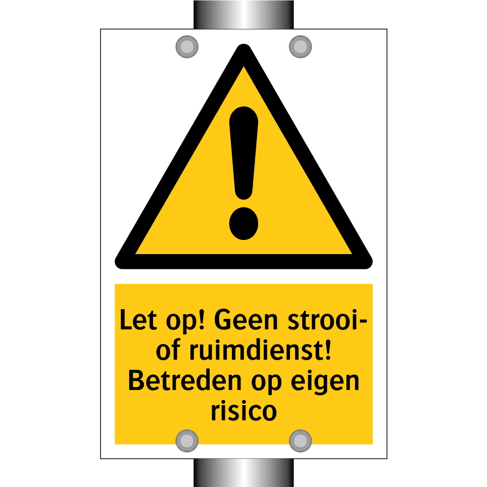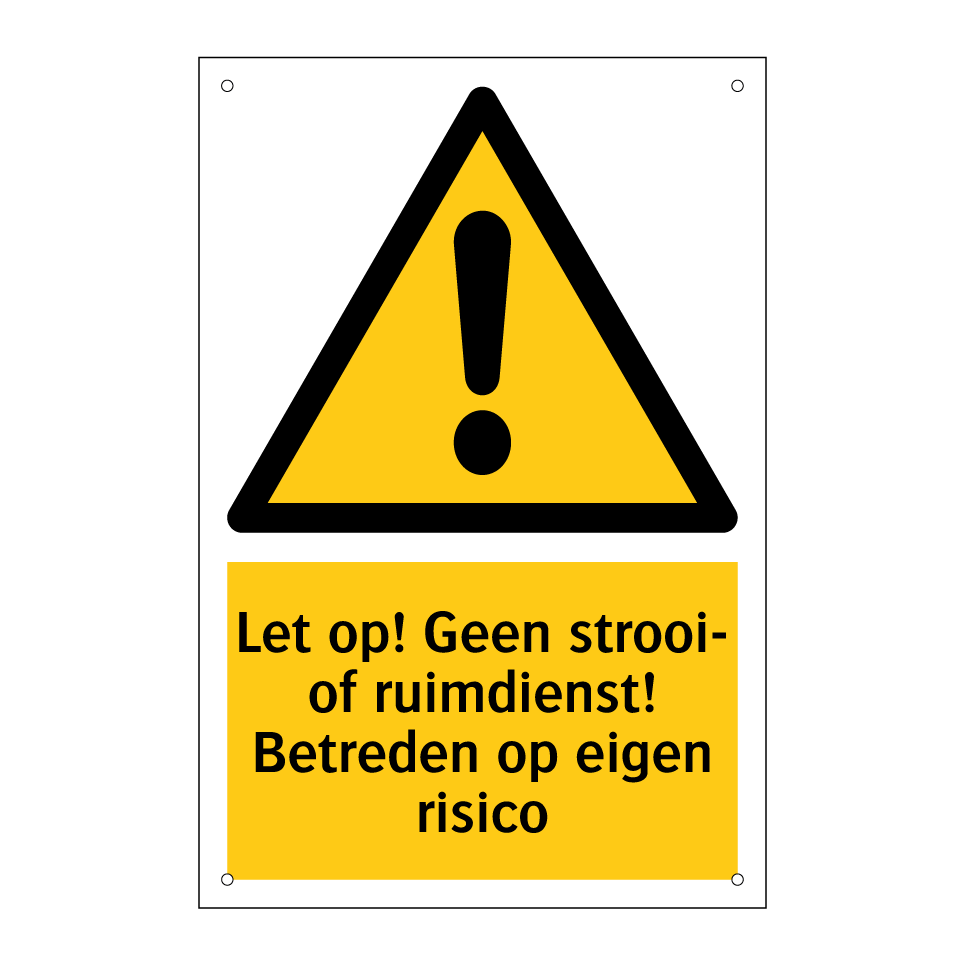 Waarschuwingsbord met de tekst Let op! Geen strooi- of ruimdienst! Betreden op eigen risico