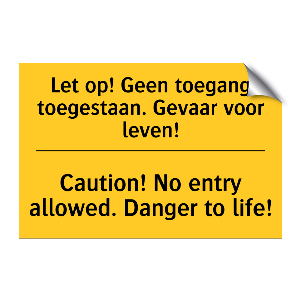 Waarschuwingsbord met de tekst Let op! Geen toegang toegestaan. Gevaar voor leven! / Caution! No entry allowed. Danger to life!