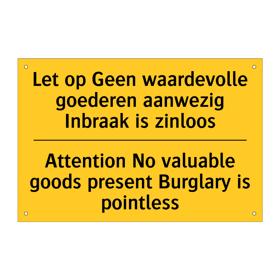 Waarschuwingsbord met de tekst Let op Geen waardevolle goederen aanwezig Inbraak is zinloos / Attention No valuable goods present Burglary is pointless