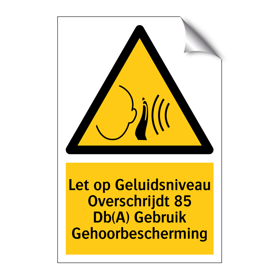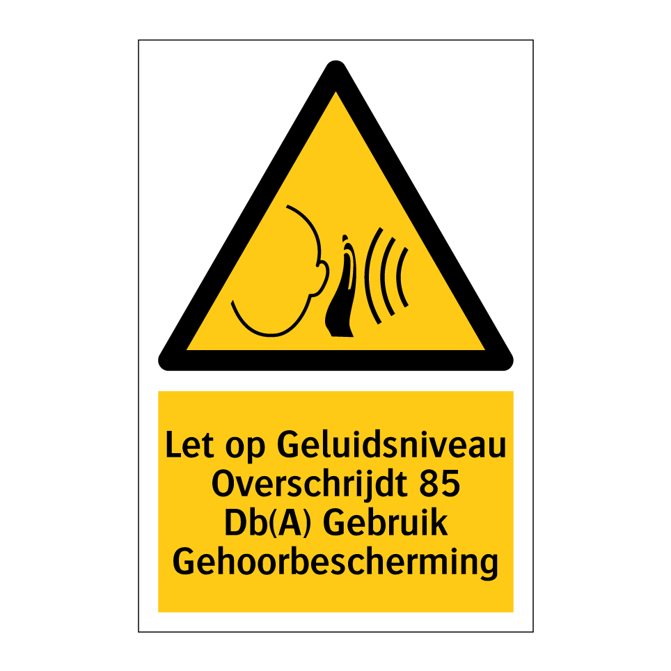Waarschuwingsbord met de tekst Let op Geluidsniveau Overschrijdt 85 Db(A) Gebruik Gehoorbescherming