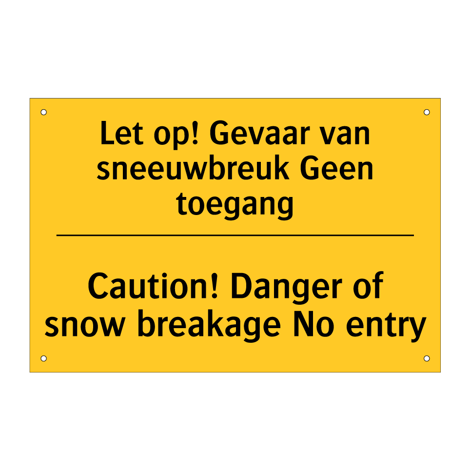 Waarschuwingsbord met de tekst Let op! Gevaar van sneeuwbreuk Geen toegang / Caution! Danger of snow breakage No entry