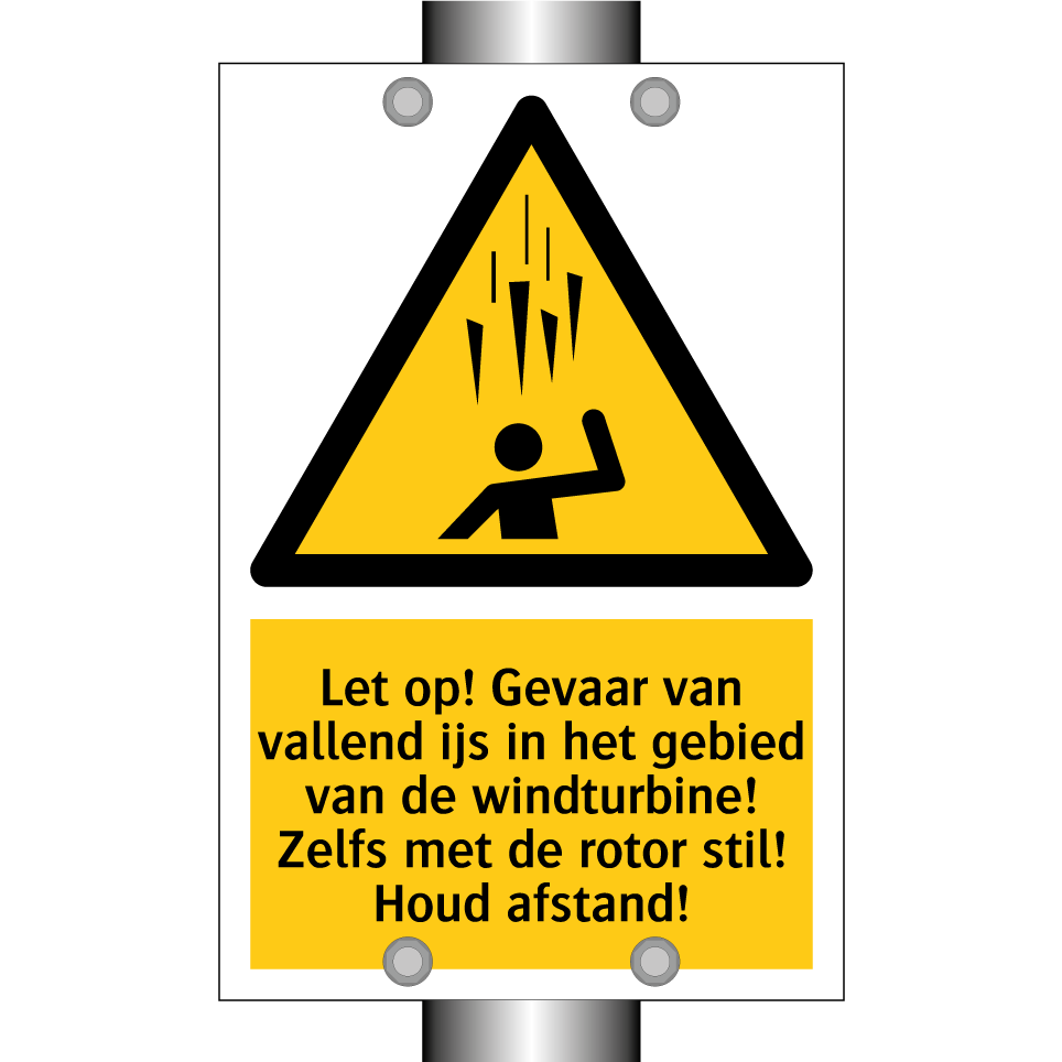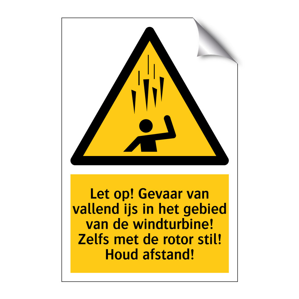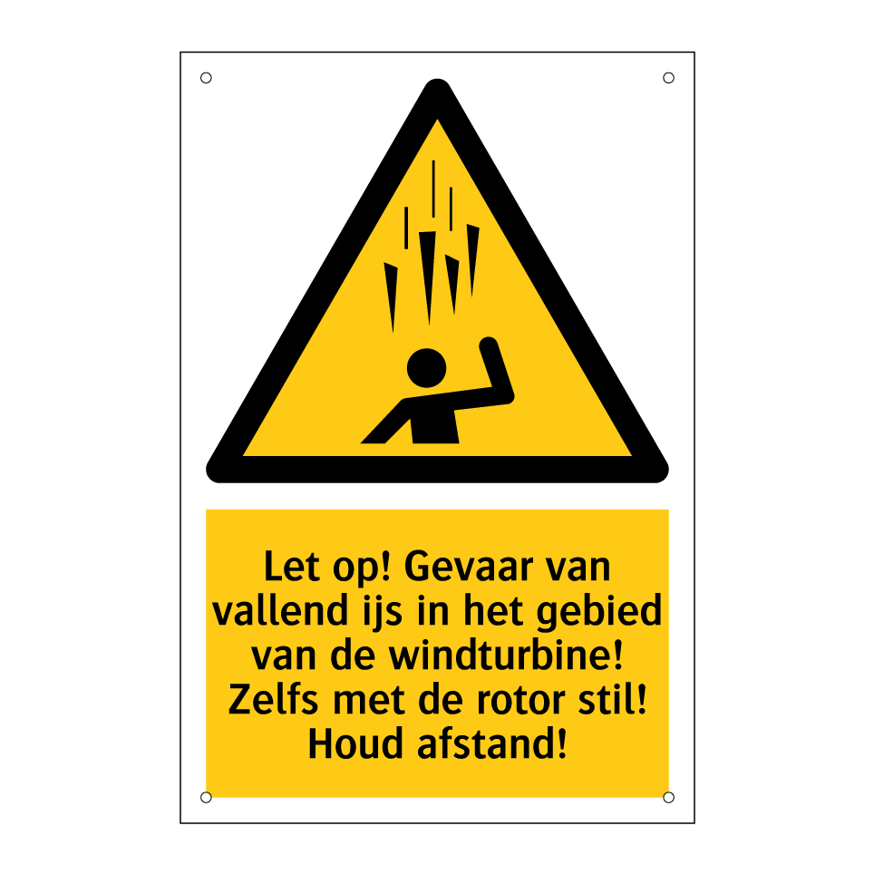Deze waarschuwingsbord is essentieel voor de veiligheid in gebieden rondom windturbines. Het waarschuwt voorbijgangers voor het gevaar van vallend ijs, zelfs wanneer de rotor niet draait. Plaats deze bord op goed zichtbare locaties zoals toegangswegen, wandelpaden en werkgebieden in de buurt van windturbines. Door deze waarschuwingsbord te gebruiken, kunnen ongelukken voorkomen worden en wordt de veiligheid van zowel werknemers als bezoekers gewaarborgd. Ideaal voor gebruik in windparken, industriële zones en andere locaties waar windturbines aanwezig zijn. Zorg ervoor dat iedereen op de hoogte is van de potentiële gevaren en houd een veilige afstand.
