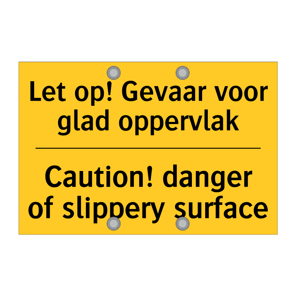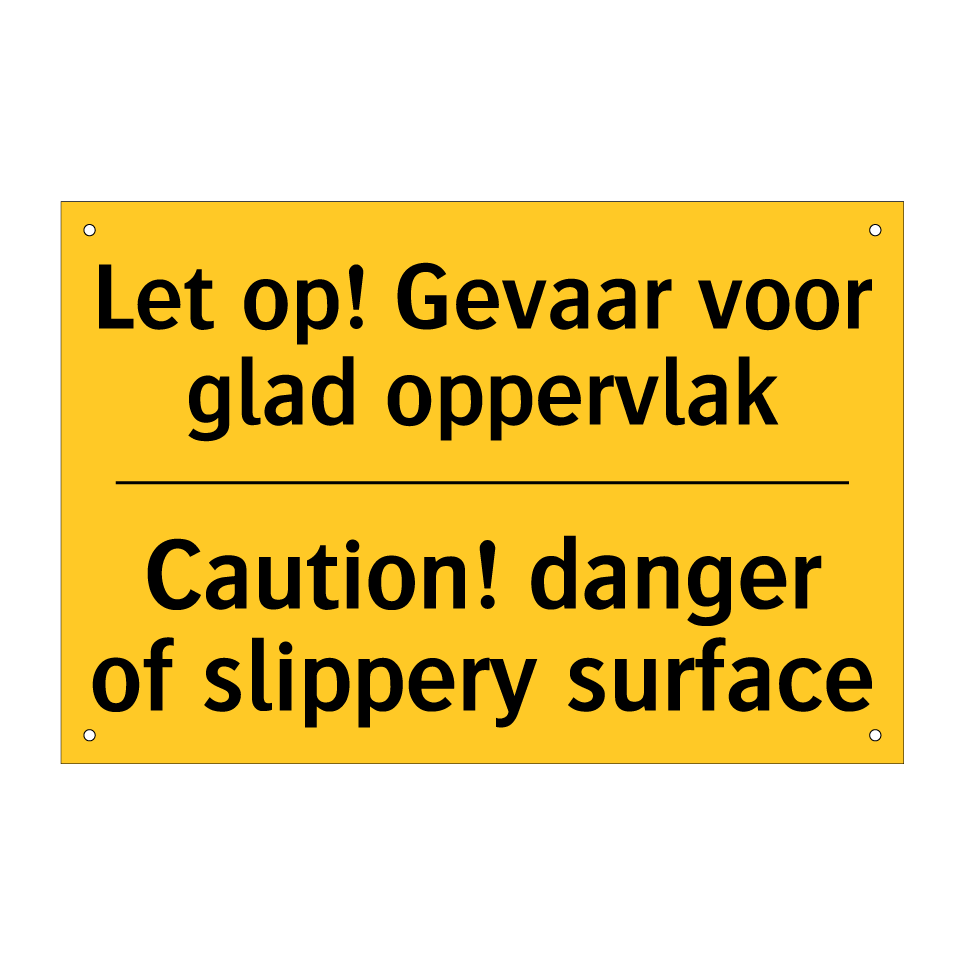 Waarschuwingsbord met de tekst Let op! Gevaar voor glad oppervlak / Caution! danger of slippery surface