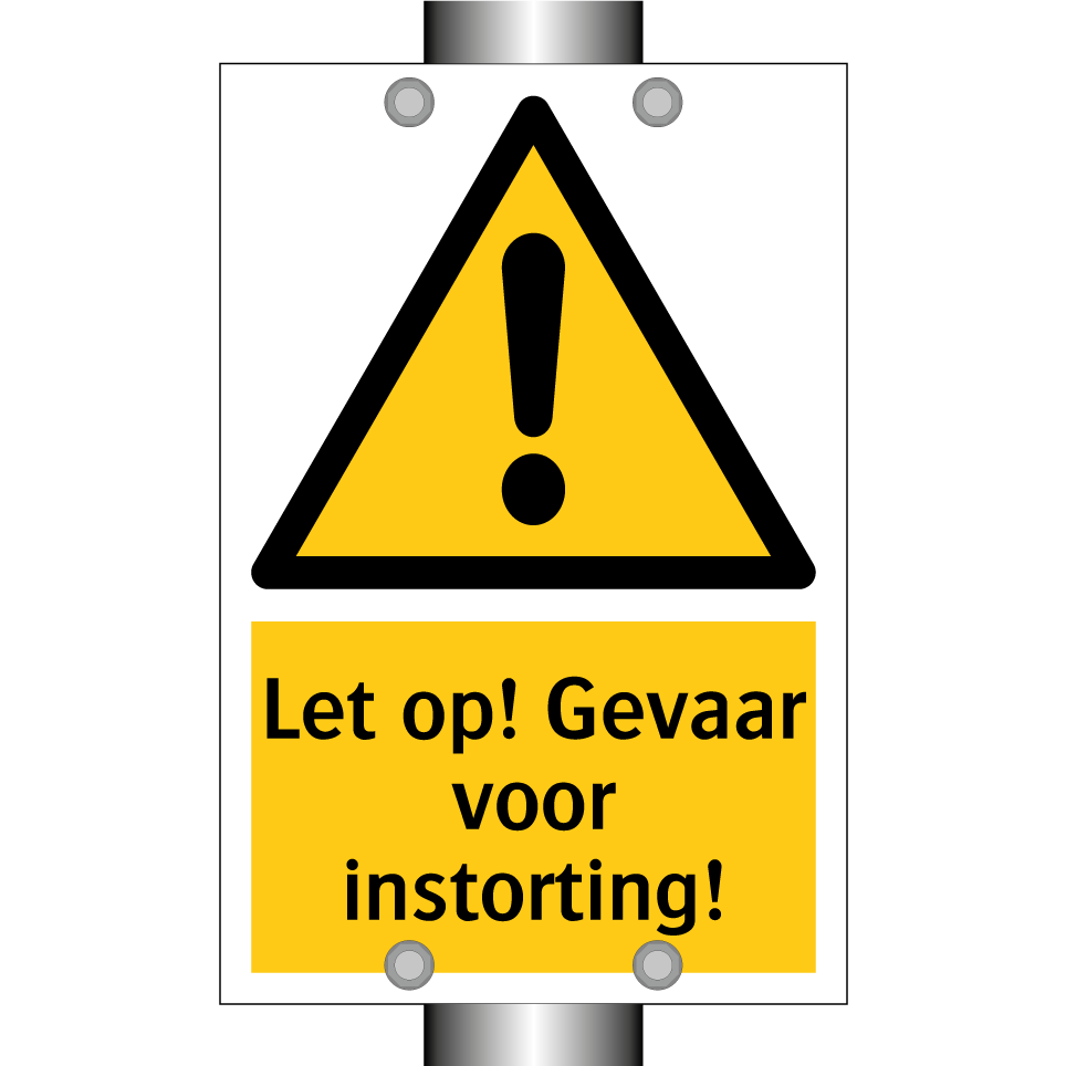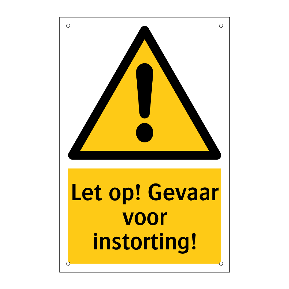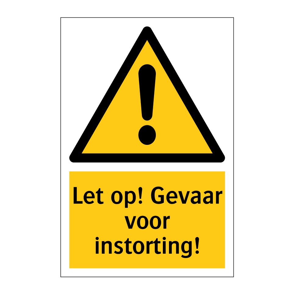 Waarschuwingsbord met de tekst Let op! Gevaar voor instorting!