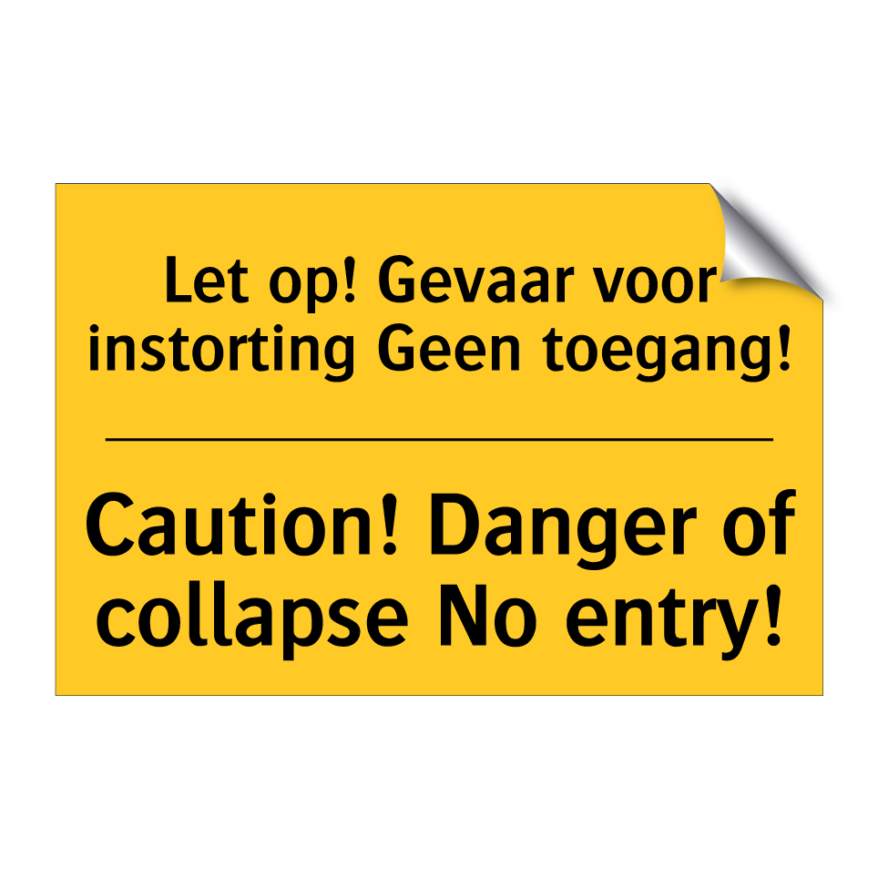 Waarschuwingsbord met de tekst Let op! Gevaar voor instorting Geen toegang! / Caution! Danger of collapse No entry!