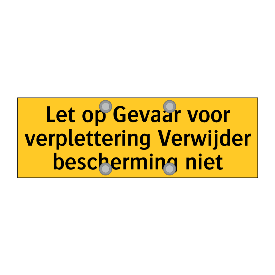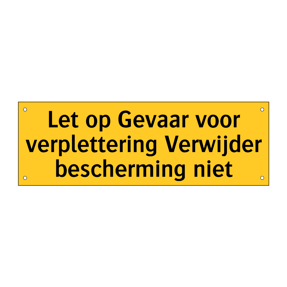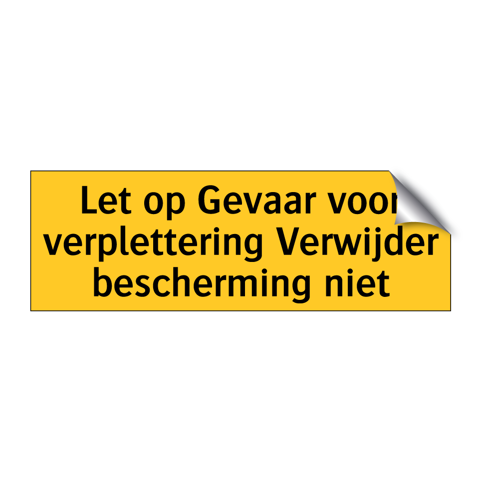 Waarschuwingsbord met de tekst Let op Gevaar voor verplettering Verwijder bescherming niet