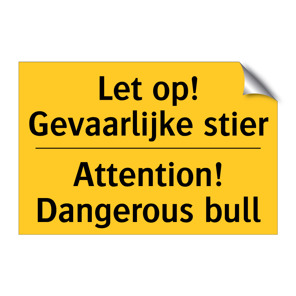 Waarschuwingsbord met de tekst Let op! Gevaarlijke stier / Attention! Dangerous bull
