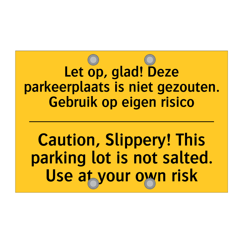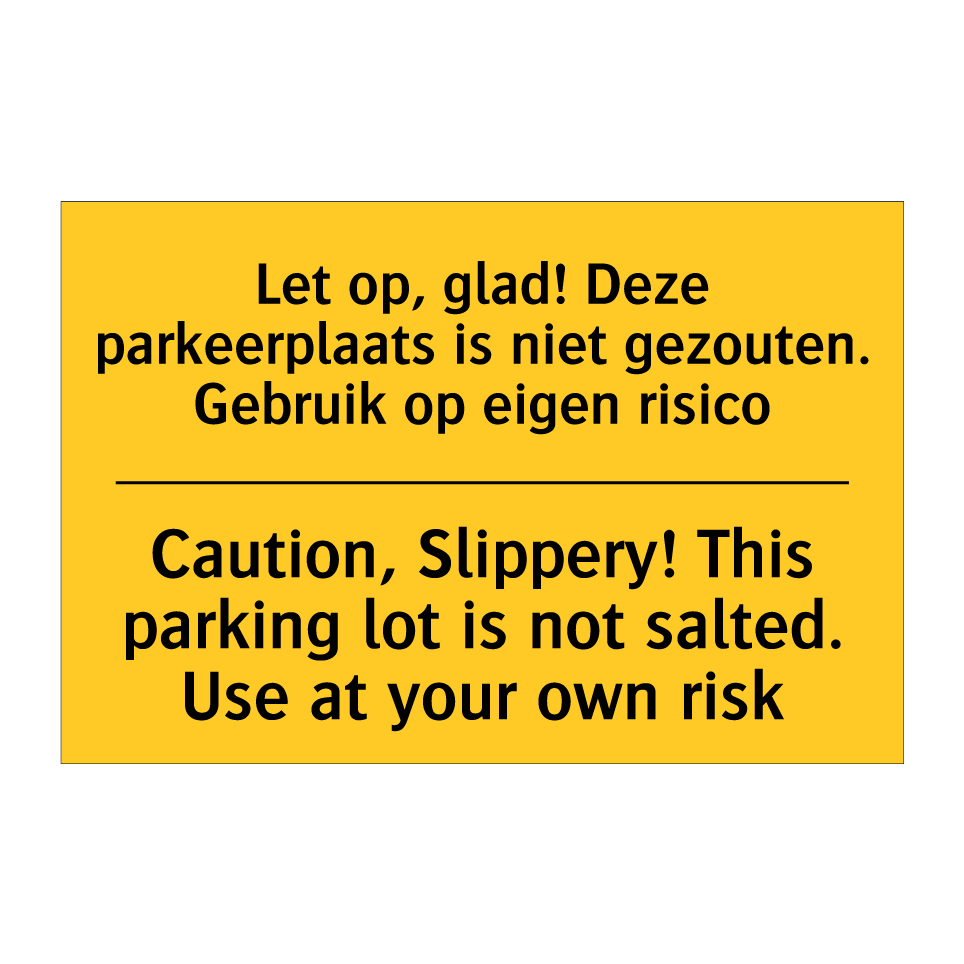 Waarschuwingsbord met de tekst Let op, glad! Deze parkeerplaats is niet gezouten. Gebruik op eigen risico / Caution, Slippery! This parking lot is not salted. Use at your own risk