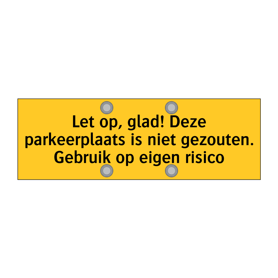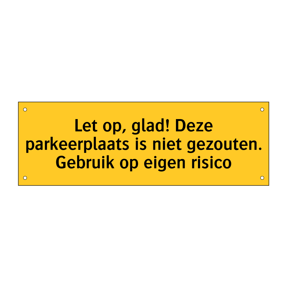 Waarschuwingsbord met de tekst Let op, glad! Deze parkeerplaats is niet gezouten. Gebruik op eigen risico
