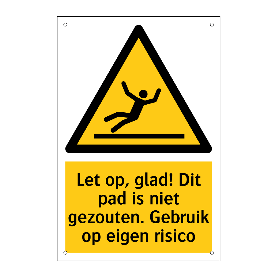 Waarschuwingsbord met de tekst Let op, glad! Dit pad is niet gezouten. Gebruik op eigen risico