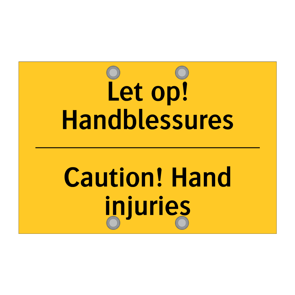Waarschuwingsbord met de tekst Let op! Handblessures / Caution! Hand injuries