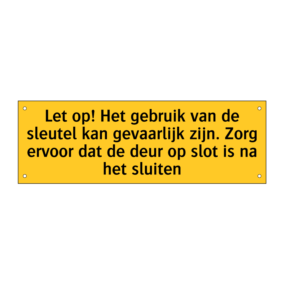 Waarschuwingsbord met de tekst Let op! Het gebruik van de sleutel kan gevaarlijk zijn. Zorg ervoor dat de deur op slot is na het sluiten