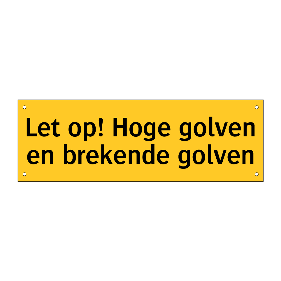 Waarschuwingsbord met de tekst Let op! Hoge golven en brekende golven