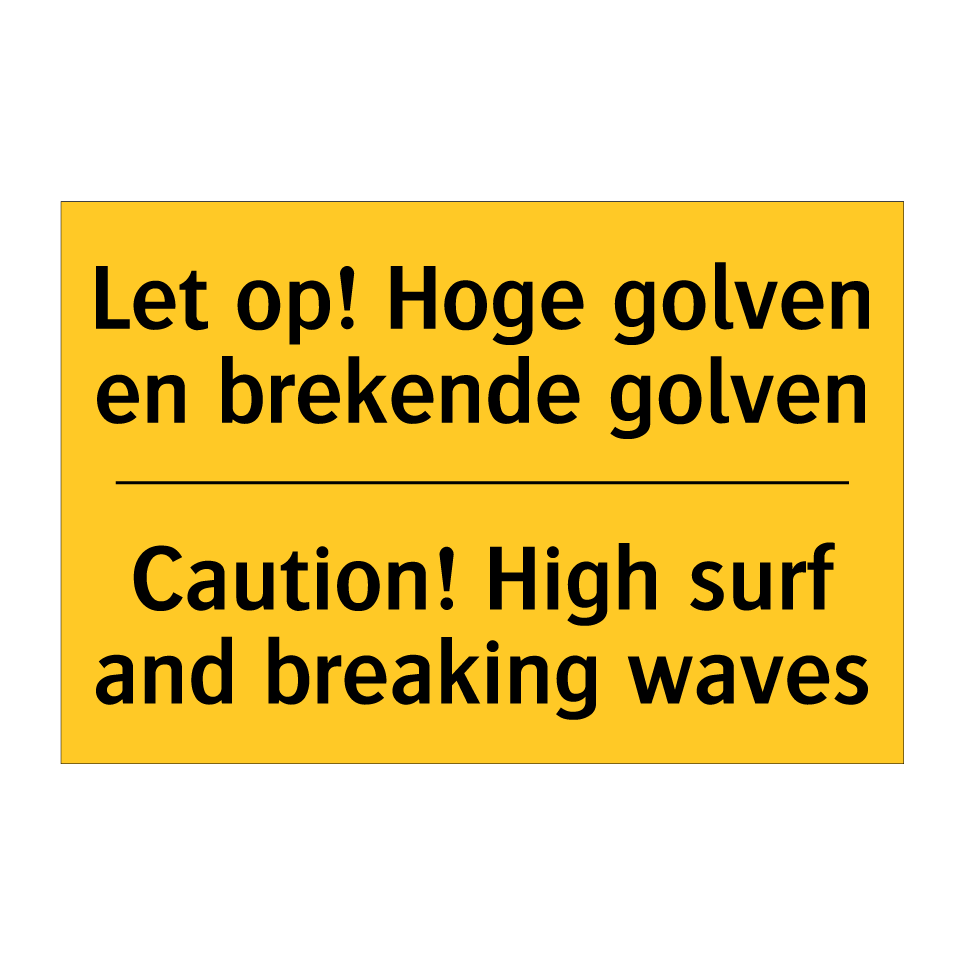 Dit waarschuwingsbord met gele achtergrond en zwarte tekst is ideaal voor gebruik op stranden, kusten en andere watergebieden waar hoge golven en brekende golven een risico vormen. De tweetalige tekst in het Nederlands en Engels zorgt ervoor dat zowel lokale bewoners als internationale bezoekers de waarschuwing begrijpen, wat de veiligheid verhoogt. Plaats dit bordje op strategische locaties zoals strandopgangen, pieren en wandelpaden langs de kust om mensen te waarschuwen voor gevaarlijke omstandigheden. Dit waarschuwingsbord helpt ongelukken te voorkomen en zorgt voor een veiligere omgeving voor iedereen die van de zee geniet.