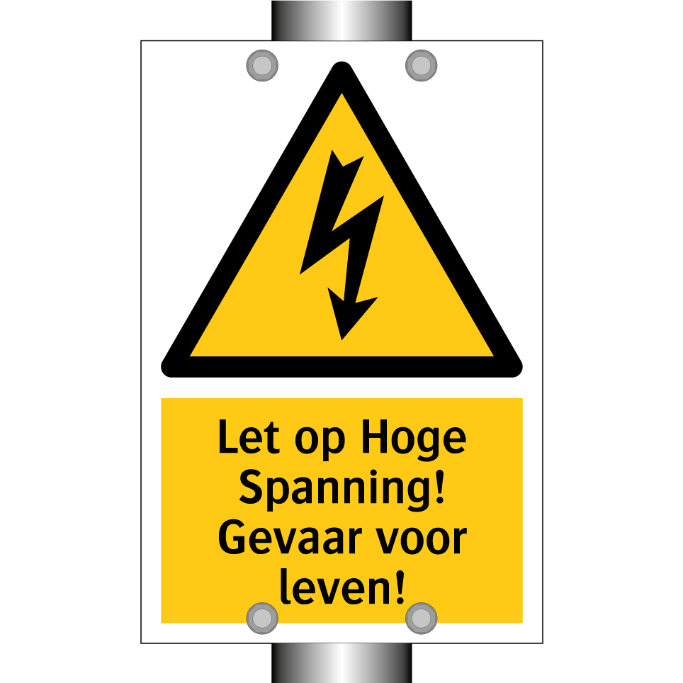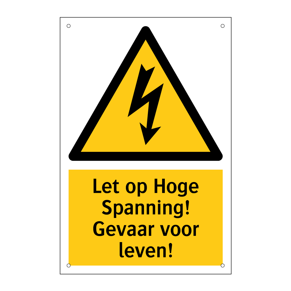 Waarschuwingsbord met de tekst Let op Hoge Spanning! Gevaar voor leven!