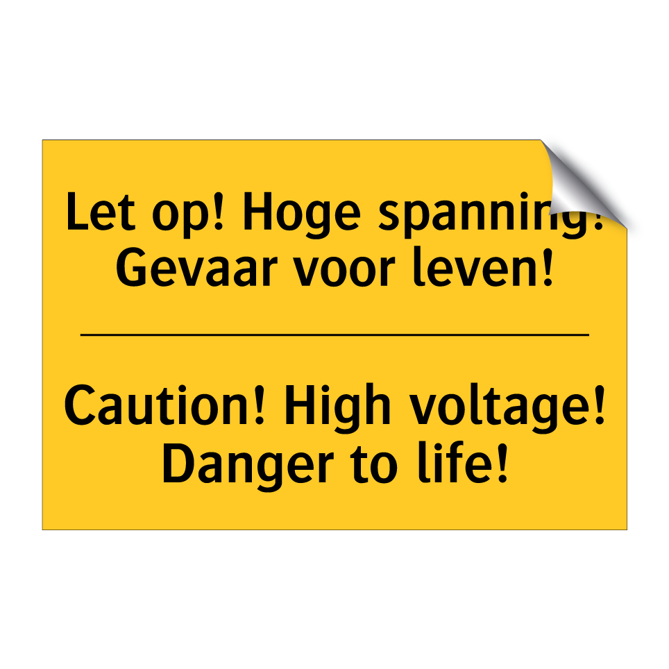 Waarschuwingsbord met de tekst Let op! Hoge spanning! Gevaar voor leven! / Caution! High voltage! Danger to life!