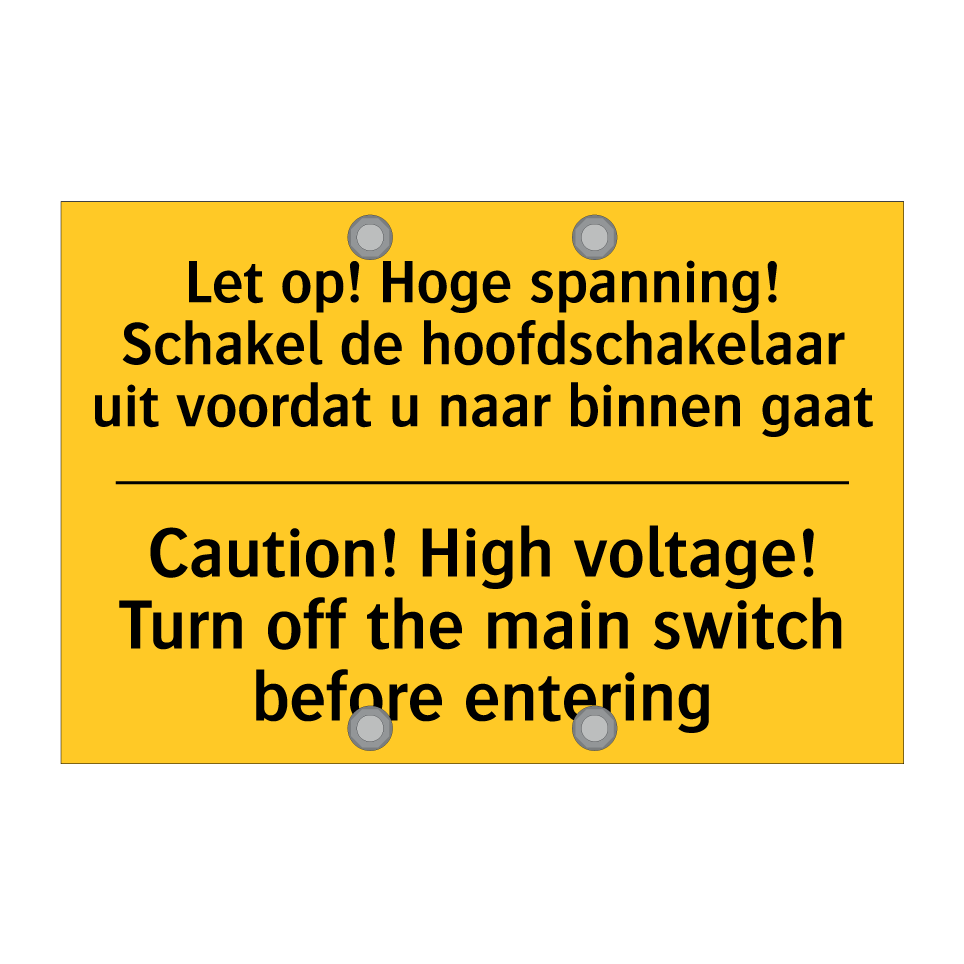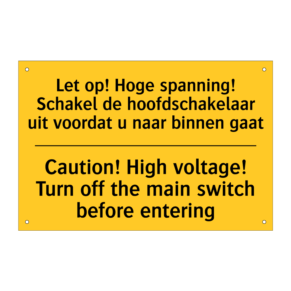 Dit waarschuwingsbord met gele achtergrond en zwarte tekst is essentieel voor de veiligheid in omgevingen met hoge spanning. De tweetalige tekst, zowel in het Nederlands als Engels, zorgt ervoor dat zowel lokale als internationale medewerkers de boodschap begrijpen. dit bordje is ideaal voor gebruik in industriële omgevingen, elektriciteitscentrales en technische ruimtes waar hoge spanning aanwezig is. Plaats het bij ingangen van elektrische kamers, schakelkasten of andere risicovolle gebieden om te waarschuwen voor gevaarlijke situaties. Het benadrukt het belang van het uitschakelen van de hoofdschakelaar voordat men naar binnen gaat, wat cruciaal is voor het voorkomen van ongelukken. Dit waarschuwingsbord verhoogt de veiligheid en bewustwording op de werkplek.