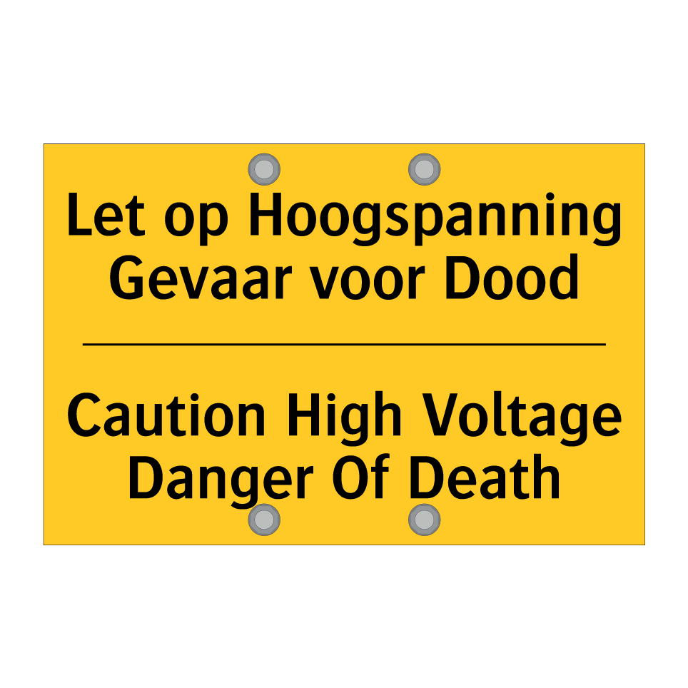 Waarschuwingsbord met de tekst Let op Hoogspanning Gevaar voor Dood / Caution High Voltage Danger Of Death
