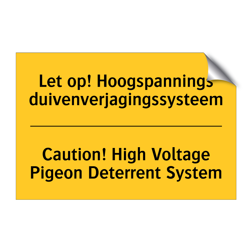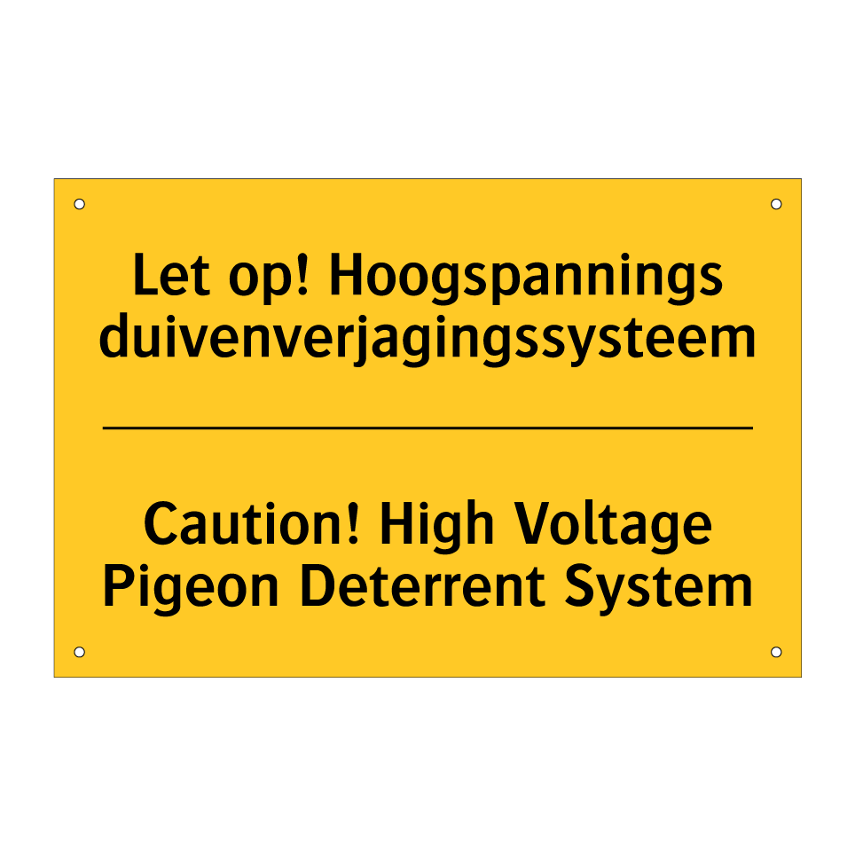 Waarschuwingsbord met de tekst Let op! Hoogspannings duivenverjagingssysteem / Caution! High Voltage Pigeon Deterrent System