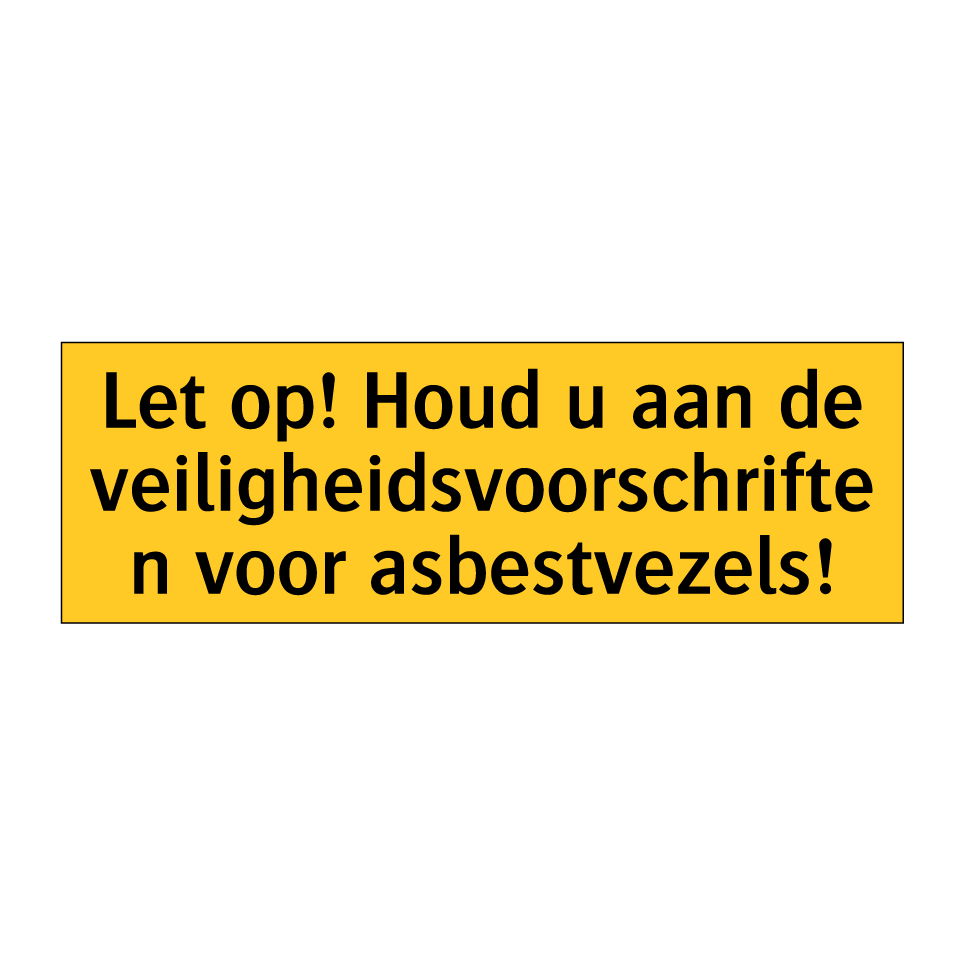 Deze waarschuwingsbord is essentieel voor het waarborgen van de veiligheid in omgevingen waar asbestvezels aanwezig kunnen zijn. Plaats deze bord op bouwplaatsen, industriële locaties of andere gebieden waar asbestverwijdering plaatsvindt. Het waarschuwt werknemers en bezoekers om zich strikt aan de veiligheidsvoorschriften te houden, waardoor het risico op blootstelling aan schadelijke asbestvezels wordt verminderd. Door de opvallende gele achtergrond en zwarte tekst is de boodschap duidelijk zichtbaar en gemakkelijk te begrijpen. Gebruik deze waarschuwingsbord om een veilige werkomgeving te bevorderen en gezondheidsrisico's te minimaliseren.