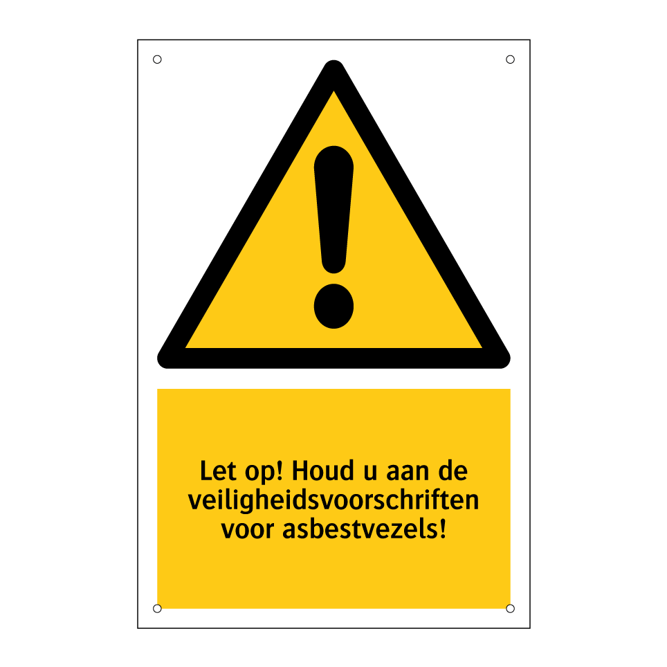 Waarschuwingsbord met de tekst Let op! Houd u aan de veiligheidsvoorschriften voor asbestvezels!