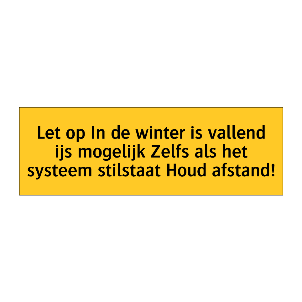 Waarschuwingsbord met de tekst Let op In de winter is vallend ijs mogelijk Zelfs als het systeem stilstaat Houd afstand!