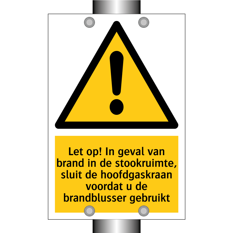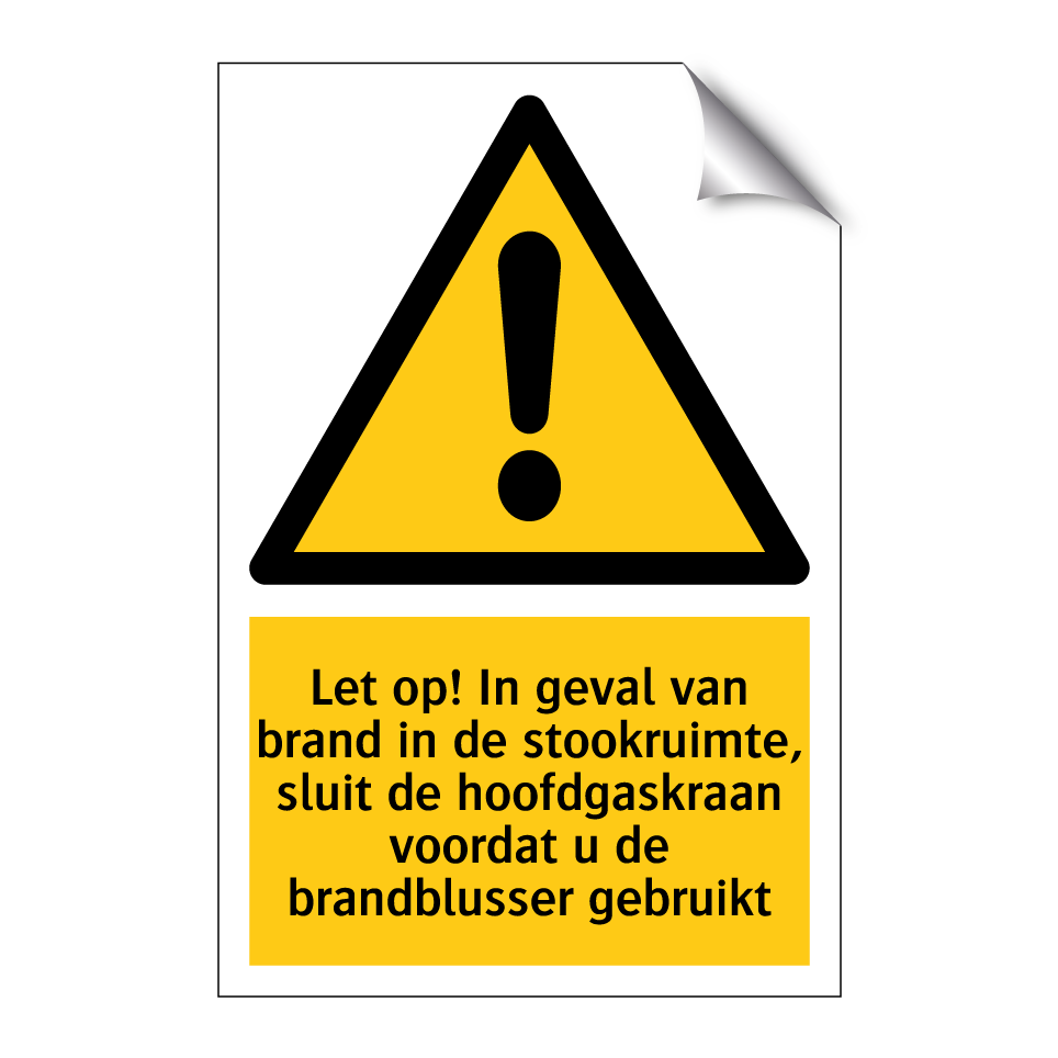 Waarschuwingsbord met de tekst Let op! In geval van brand in de stookruimte, sluit de hoofdgaskraan voordat u de brandblusser gebruikt