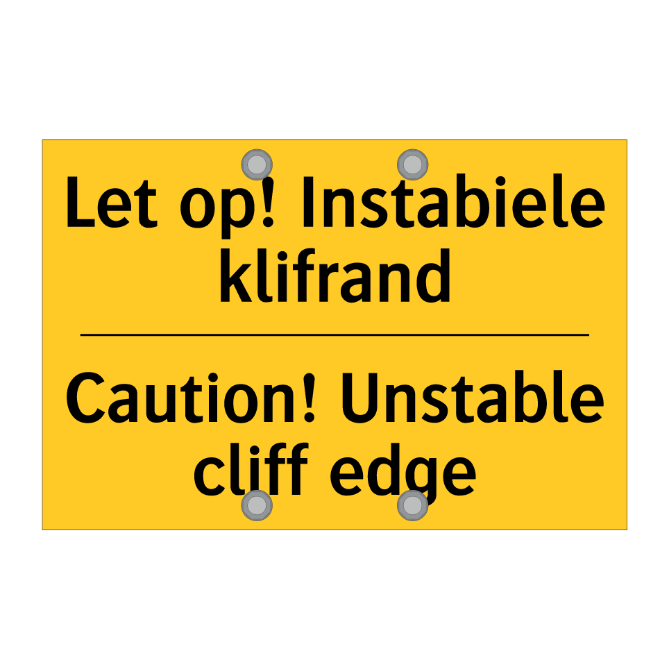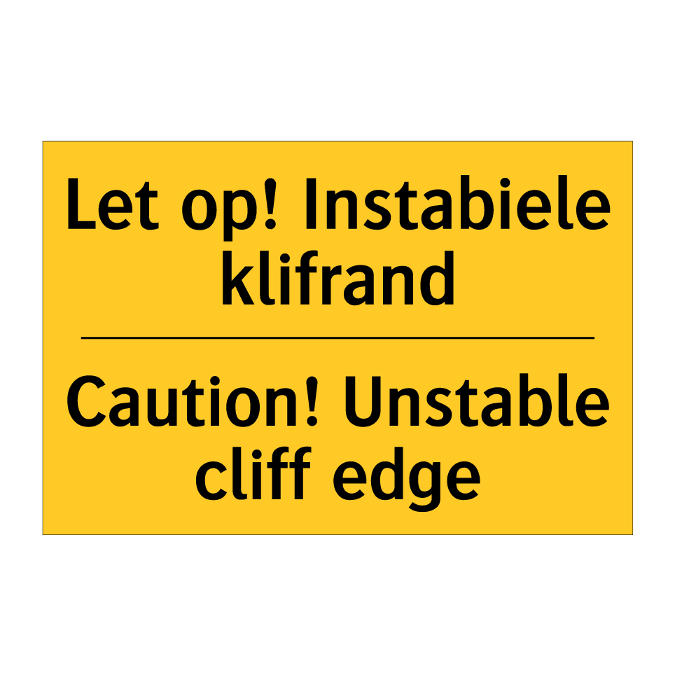 Waarschuwingsbord met de tekst Let op! Instabiele klifrand / Caution! Unstable cliff edge