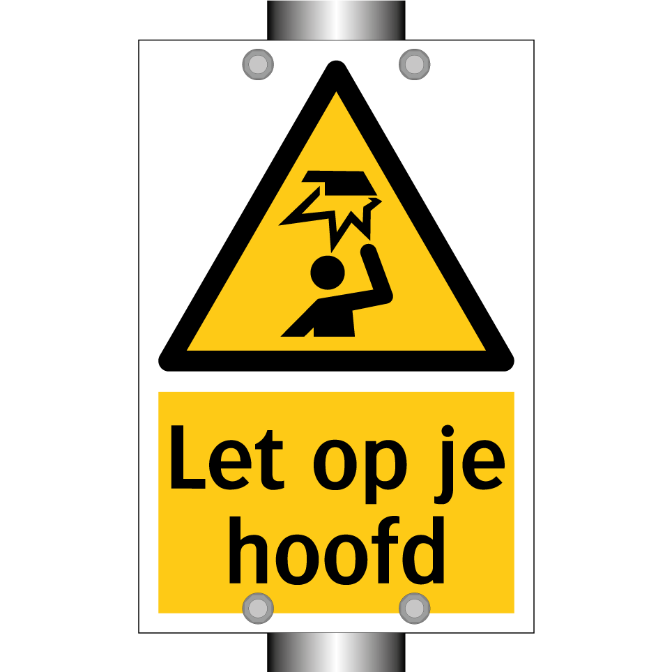 Deze waarschuwingsbord is essentieel voor het waarborgen van de veiligheid in omgevingen met lage doorgangen. Plaats deze bord op strategische locaties zoals ingangen van kelders, magazijnen, parkeergarages en andere ruimtes waar het risico bestaat dat mensen hun hoofd stoten. Door deze bord te gebruiken, waarschuwt u effectief personeel en bezoekers om alert te zijn en letsel te voorkomen. Dit waarschuwingsbord is een onmisbaar hulpmiddel in elke omgeving waar hoofdbescherming cruciaal is. Zorg ervoor dat iedereen zich bewust is van mogelijke gevaren door deze duidelijke en opvallende bord te plaatsen.
