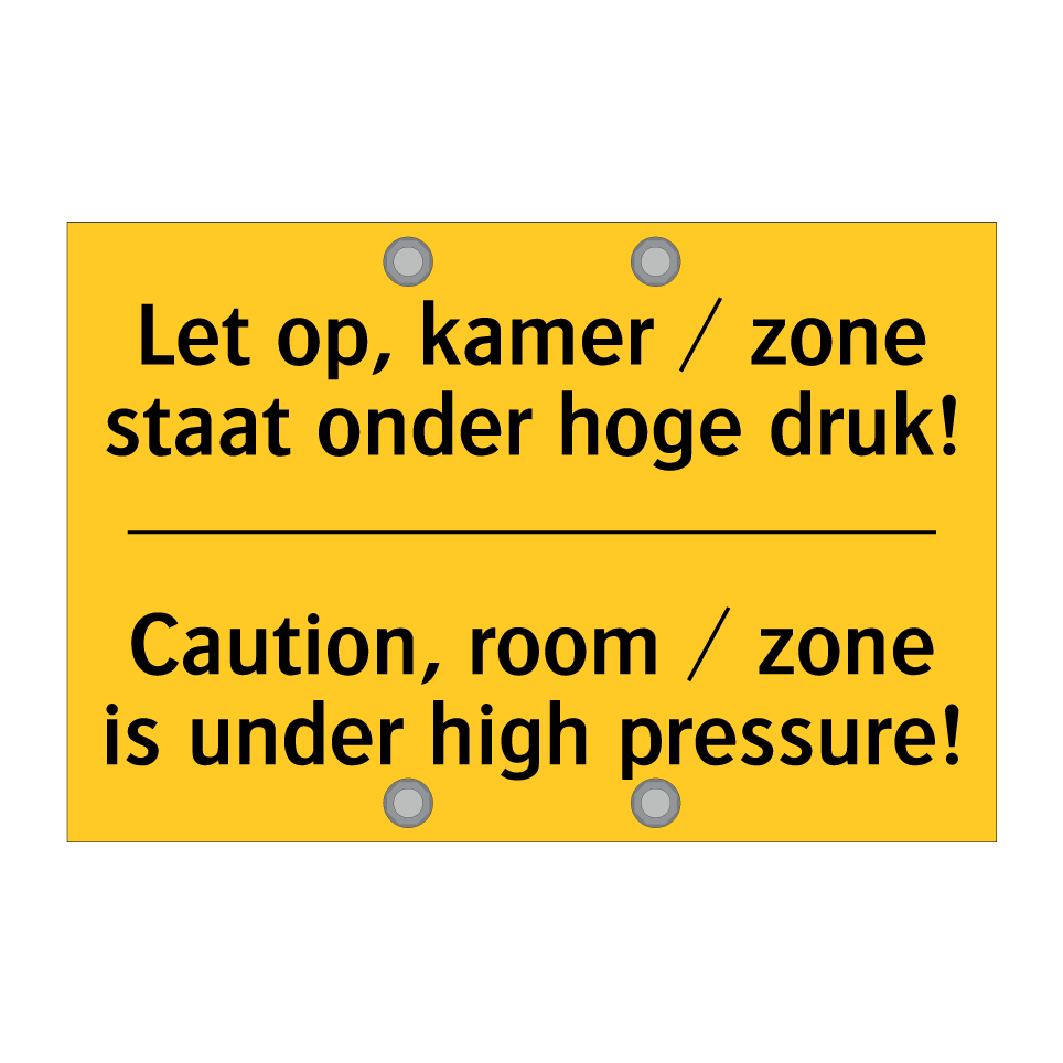 Waarschuwingsbord met de tekst Let op, kamer / zone staat onder hoge druk! / Caution, room / zone is under high pressure!