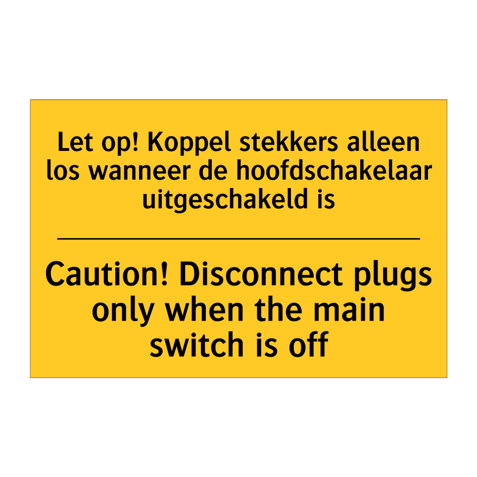 Waarschuwingsbord met de tekst Let op! Koppel stekkers alleen los wanneer de hoofdschakelaar uitgeschakeld is / Caution! Disconnect plugs only when the main switch is off