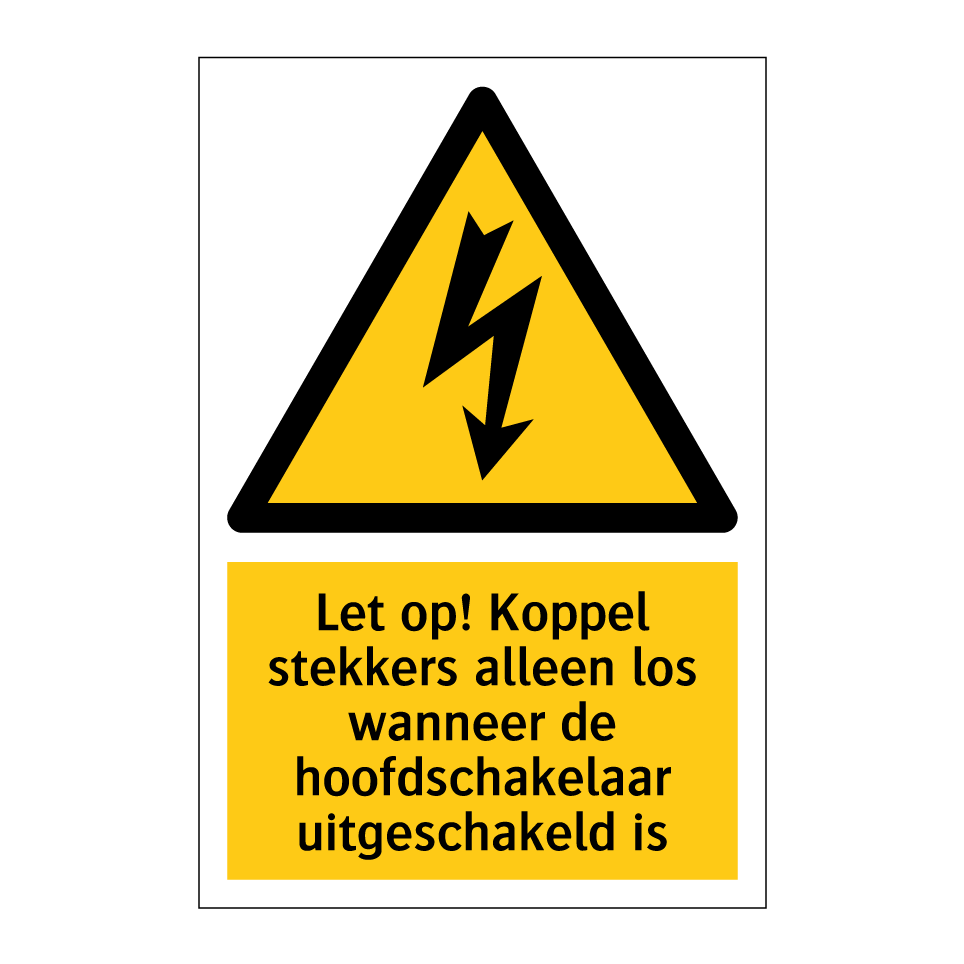 Waarschuwingsbord met de tekst Let op! Koppel stekkers alleen los wanneer de hoofdschakelaar uitgeschakeld is