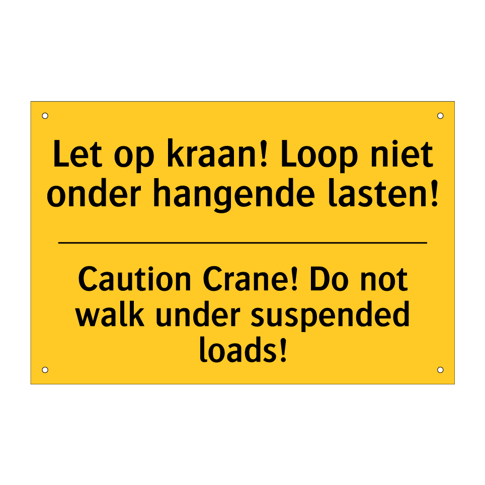 Waarschuwingsbord met de tekst Let op kraan! Loop niet onder hangende lasten! / Caution Crane! Do not walk under suspended loads!