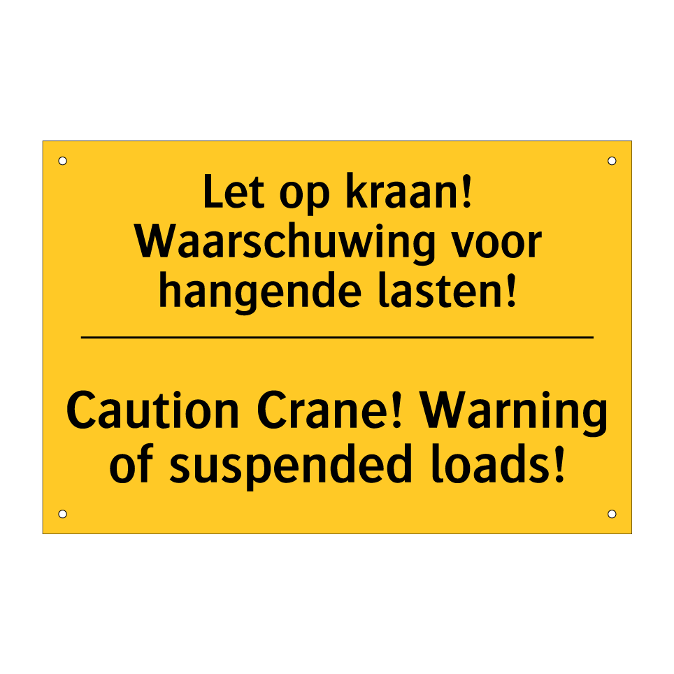 Waarschuwingsbord met de tekst Let op kraan! Waarschuwing voor hangende lasten! / Caution Crane! Warning of suspended loads!