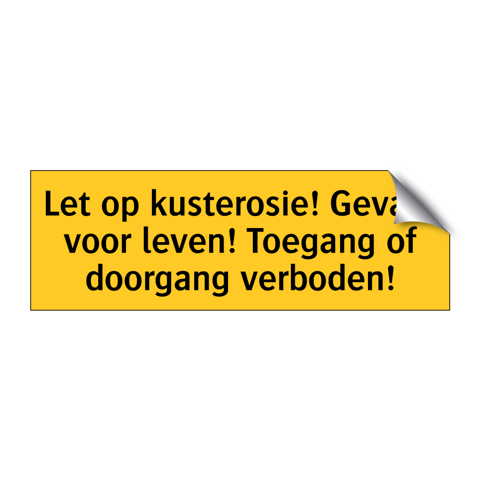 Waarschuwingsbord met de tekst Let op kusterosie! Gevaar voor leven! Toegang of doorgang verboden!