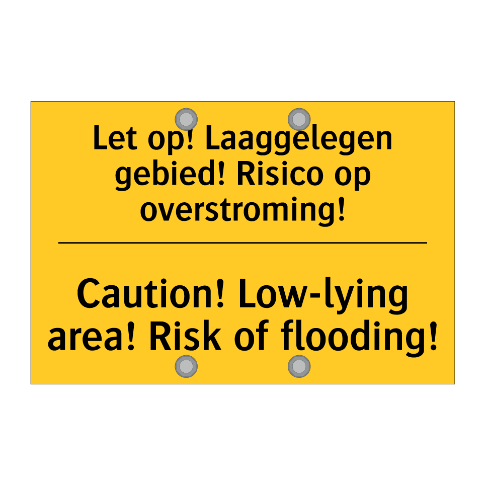 Waarschuwingsbord met de tekst Let op! Laaggelegen gebied! Risico op overstroming! / Caution! Low-lying area! Risk of flooding!