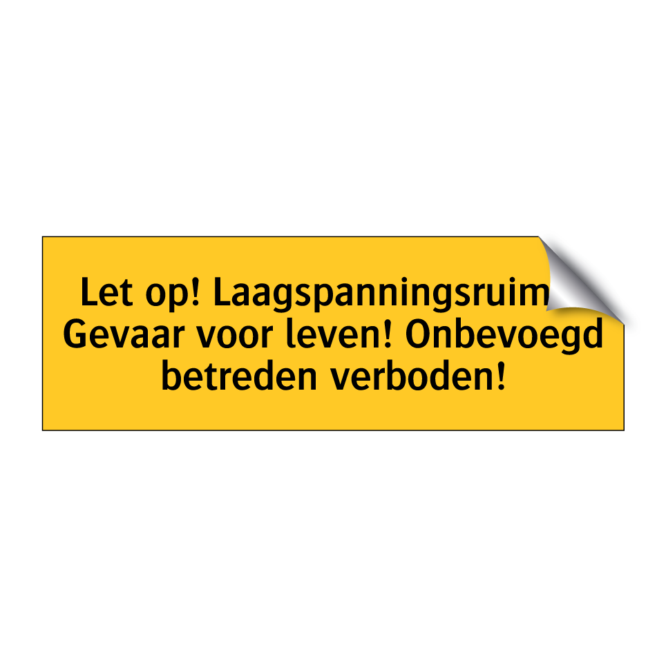 Waarschuwingsbord met de tekst Let op! Laagspanningsruimte Gevaar voor leven! Onbevoegd betreden verboden!