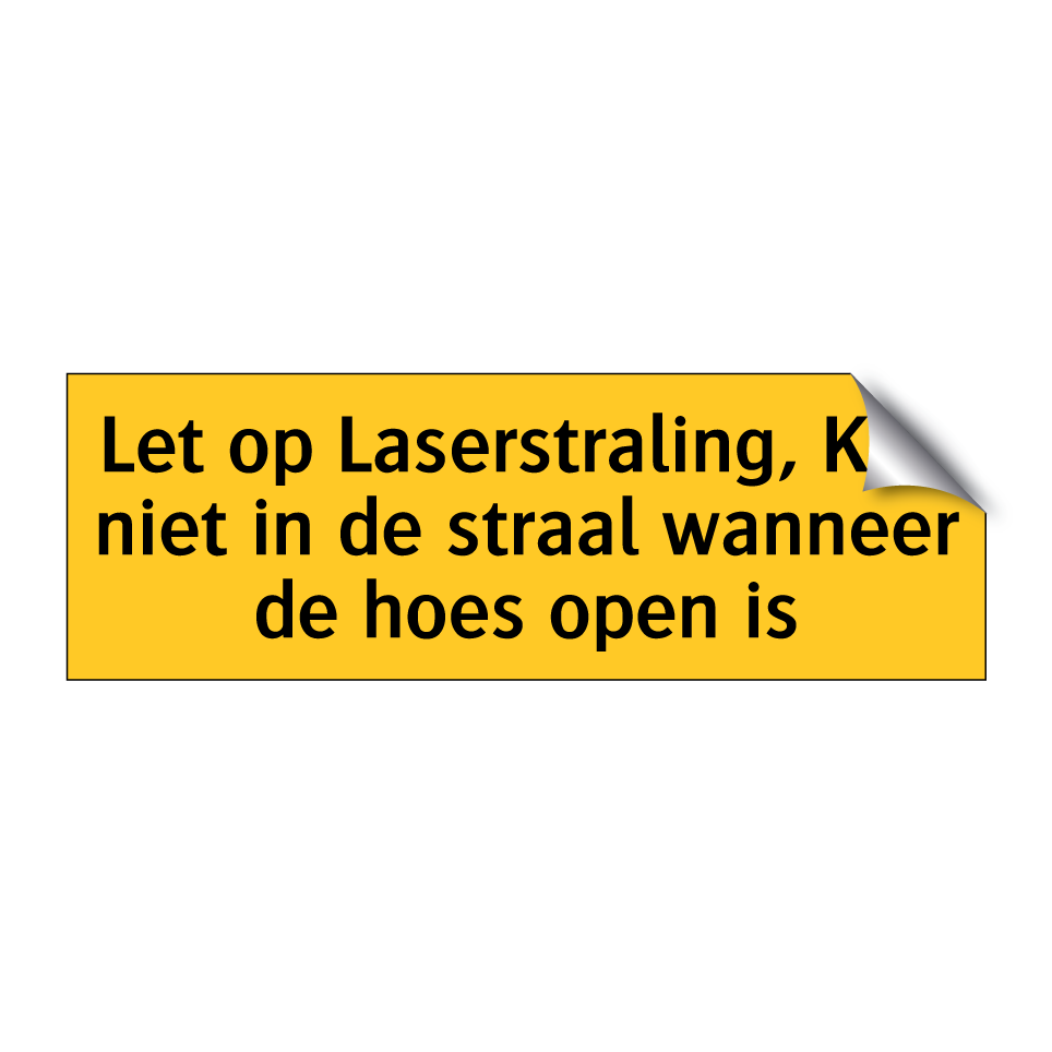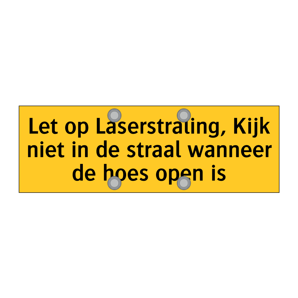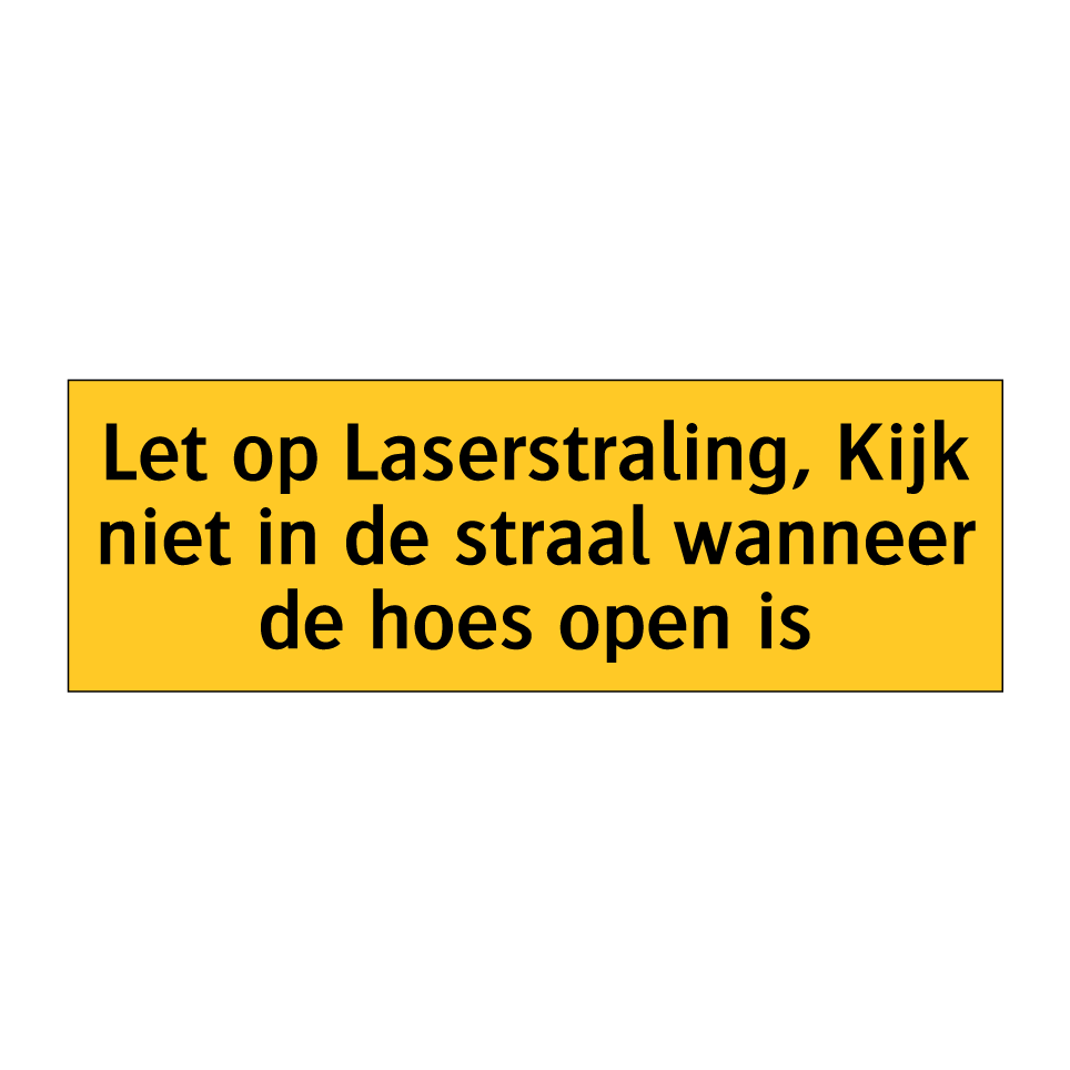 Waarschuwingsbord met de tekst Let op Laserstraling, Kijk niet in de straal wanneer de hoes open is
