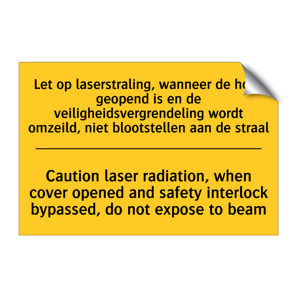 Waarschuwingsbord met de tekst Let op laserstraling, wanneer de hoes geopend is en de veiligheidsvergrendeling wordt omzeild, niet blootstellen aan de straal / Caution laser radiation, when cover opened and safety interlock bypassed, do not expose to beam