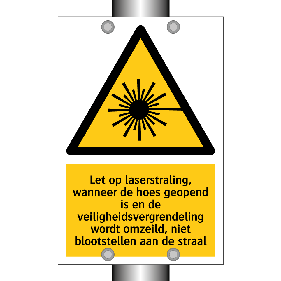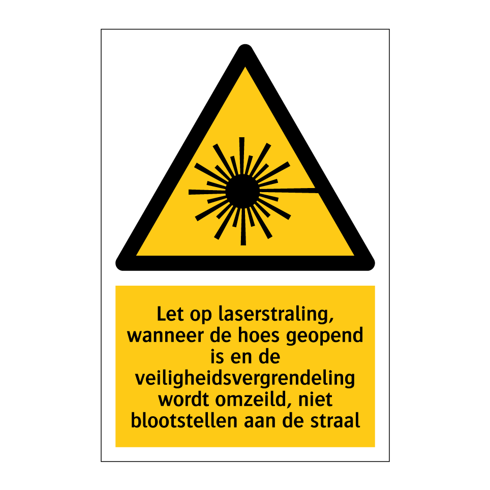 Waarschuwingsbord met de tekst Let op laserstraling, wanneer de hoes geopend is en de veiligheidsvergrendeling wordt omzeild, niet blootstellen aan de straal