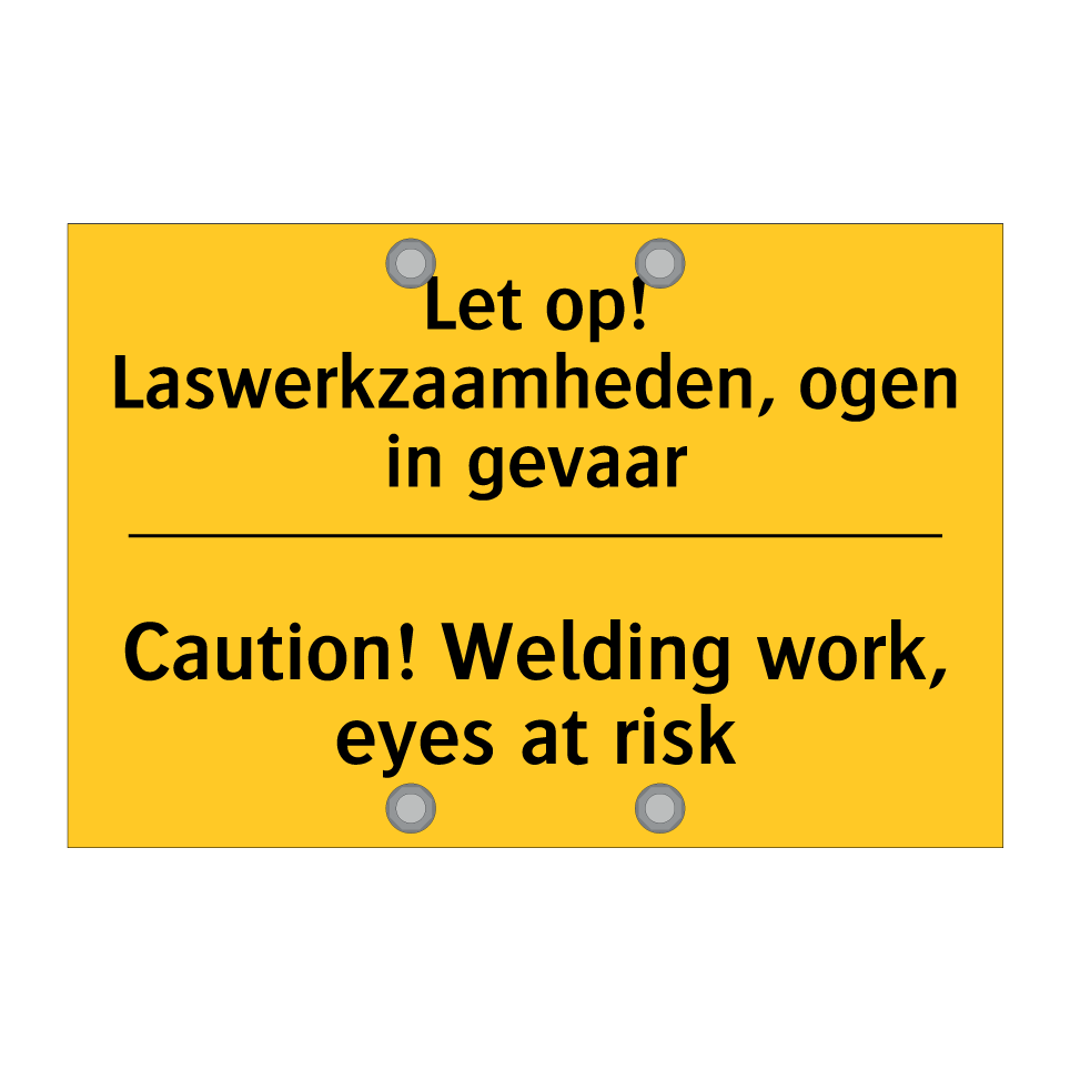 Waarschuwingsbord met de tekst Let op! Laswerkzaamheden, ogen in gevaar / Caution! Welding work, eyes at risk