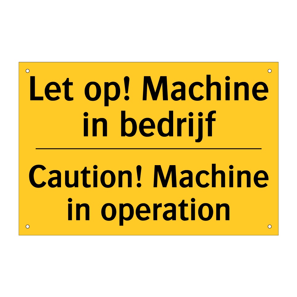 Waarschuwingsbord met de tekst Let op! Machine in bedrijf / Caution! Machine in operation