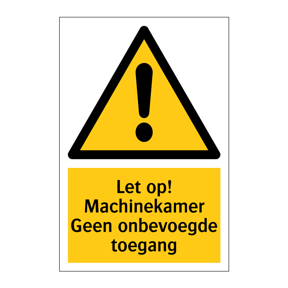 Waarschuwingsbord met de tekst Let op! Machinekamer Geen onbevoegde toegang