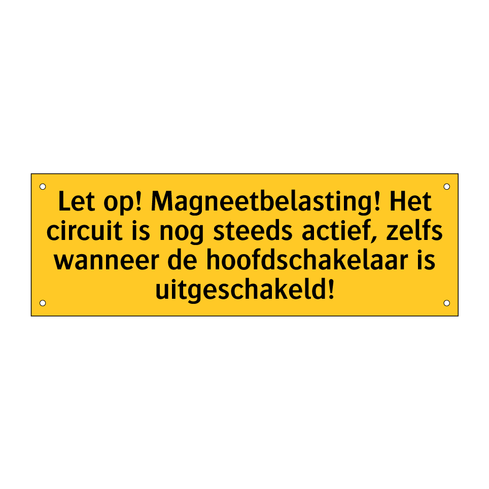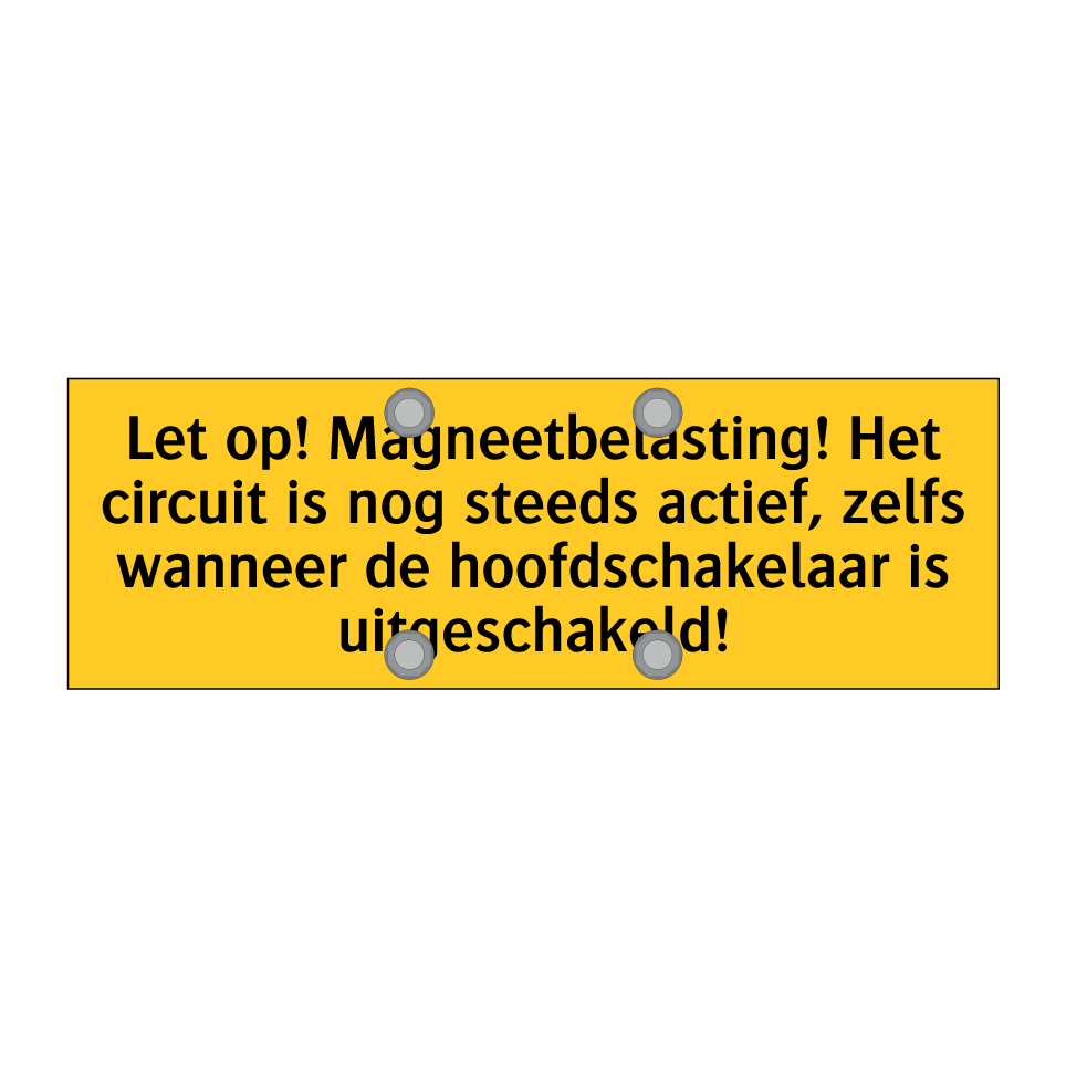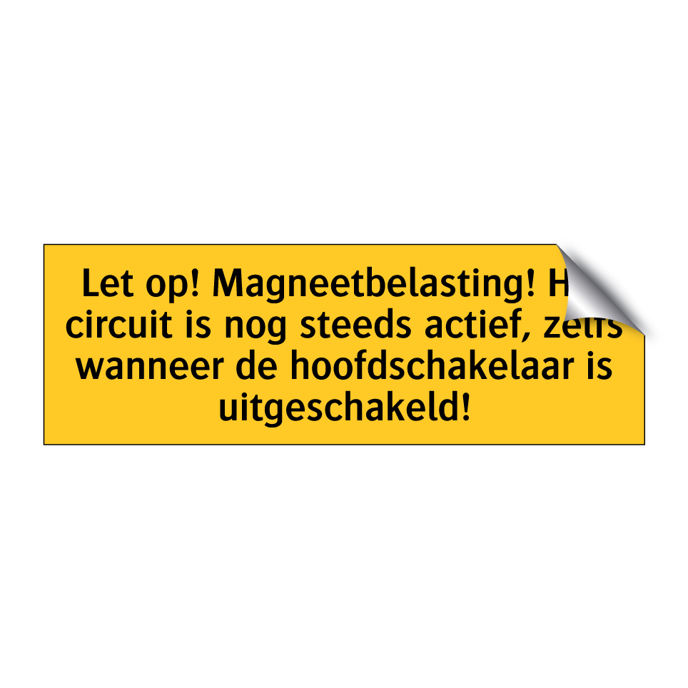 Waarschuwingsbord met de tekst Let op! Magneetbelasting! Het circuit is nog steeds actief, zelfs wanneer de hoofdschakelaar is uitgeschakeld!