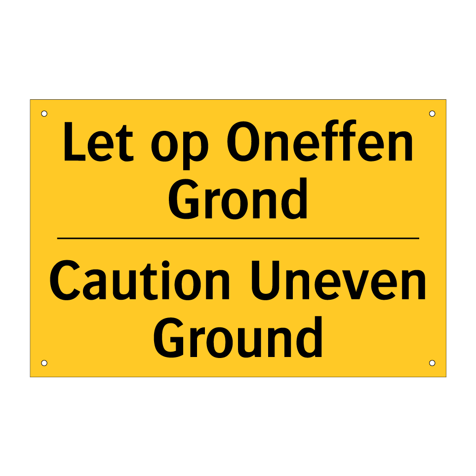 Waarschuwingsbord met de tekst Let op Oneffen Grond / Caution Uneven Ground
