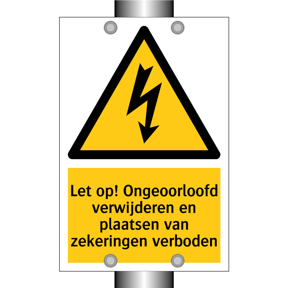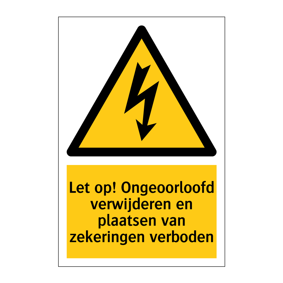 Waarschuwingsbord met de tekst Let op! Ongeoorloofd verwijderen en plaatsen van zekeringen verboden