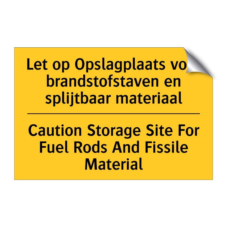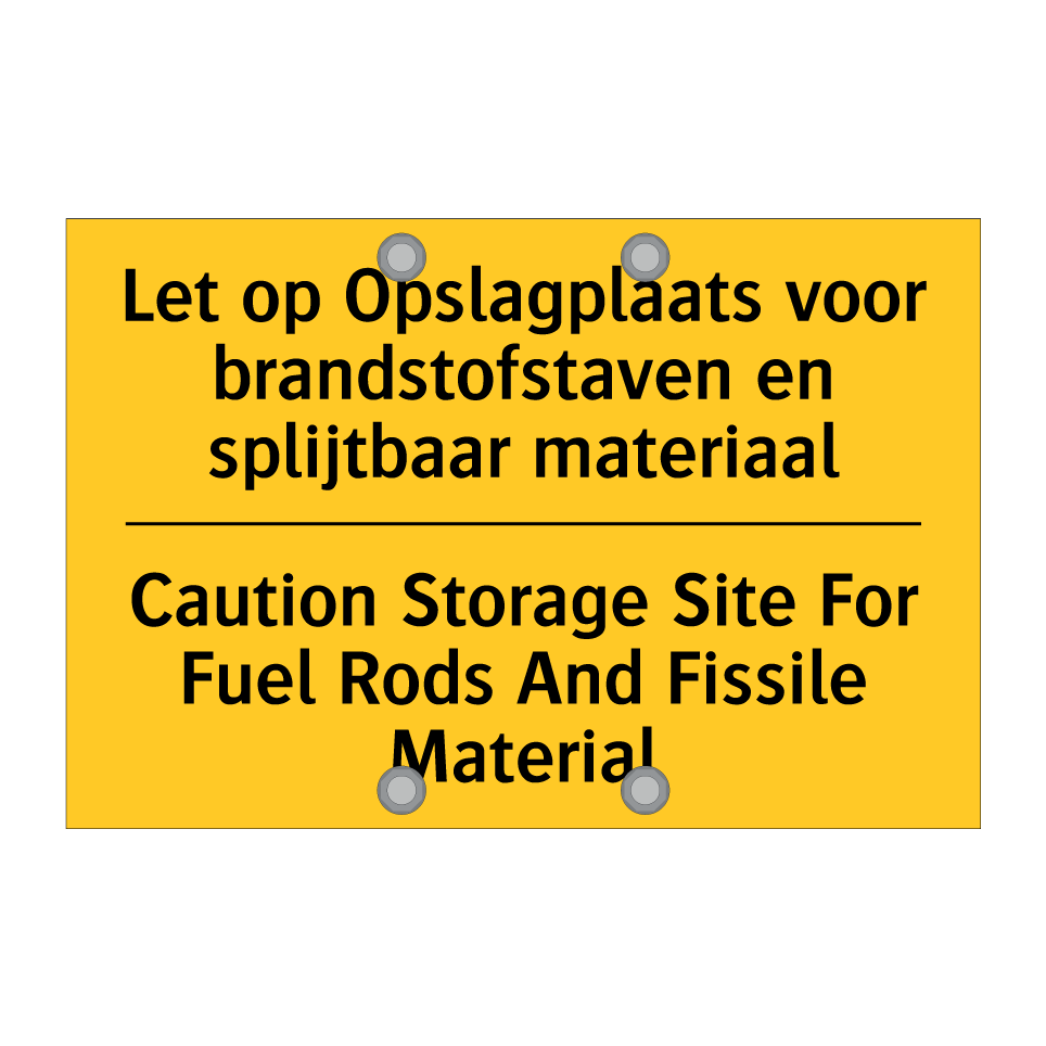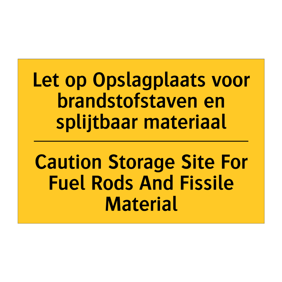 Waarschuwingsbord met de tekst Let op Opslagplaats voor brandstofstaven en splijtbaar materiaal / Caution Storage Site For Fuel Rods And Fissile Material