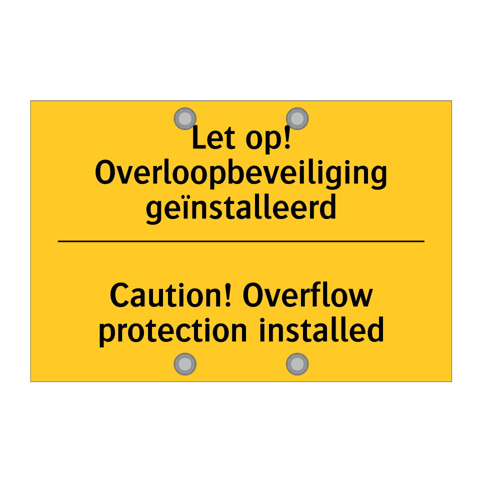 Waarschuwingsbord met de tekst Let op! Overloopbeveiliging geïnstalleerd / Caution! Overflow protection installed